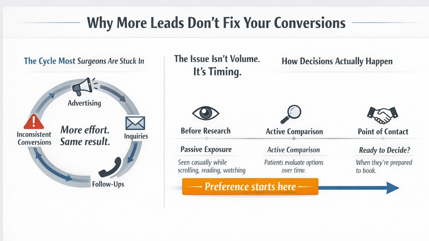 Most surgeons remain in the same cycle: more advertising, more inquiries, and more follow-ups, yet inconsistent conversion. The issue is not volume. It is timing. The decision does not occur at the point of contact. It occurs before patients begin researching, during passive exposure in environments they encounter daily.